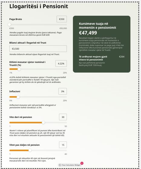 Ky kalkulator bazohet në skemën e Trustit të Kosovës, pensioni obligativ për kontribuesit aktivë në Kosovë.